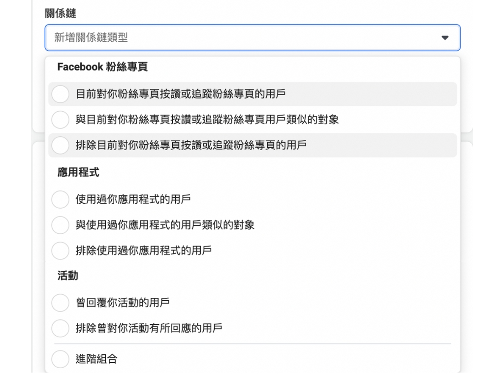 關係鏈條件主要是針對曾經與我們品牌互動過的用戶,包含粉絲專頁、應用程式及活動三個面相,可以利用這個條件縮小受眾範圍,找到更精準的品牌愛好者;也可以利用排除功能,排除已經和品牌互動過的用戶,並尋找更多潛在客戶,適合需要大量擴散的新品牌。