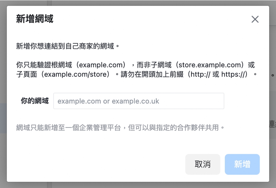 如果品牌擁有自己的網站,透過驗證網域才能設定彙總事件成效衡量,同時也是向Facebook證明你擁有這個網域的所有權,並且保護內容的安全,也避免網域名稱被濫用。